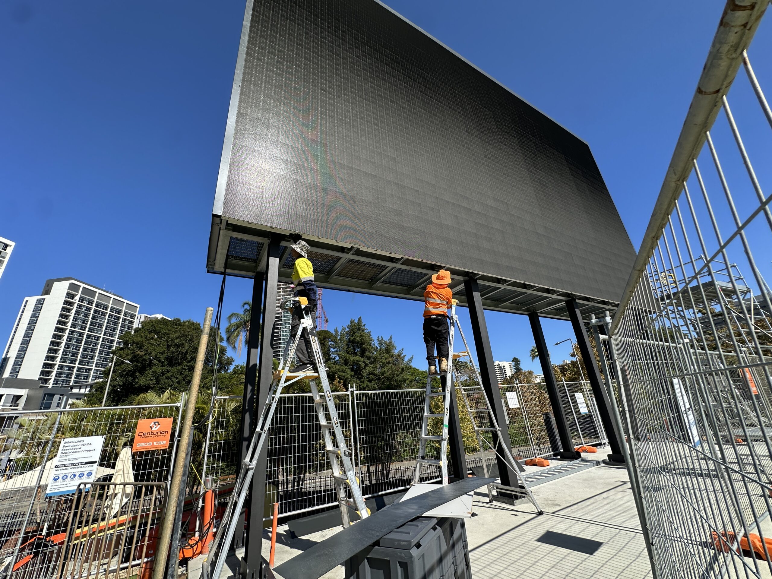 Also part of the site crew, Phil and JR were on ladders completing the finishing touches to the impressive Surevision 14-metre-wide digital videoboard, also at the WACA. This massive display is 14 metres wide and a centrepiece of the venue’s ongoing redevelopment. It’s a great example of the large-scale digital signage solutions delivered by the Yap!digital team.