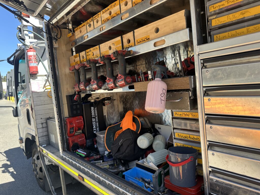 We also took the opportunity to showcase our 5S approach — a system that keeps our workspaces efficient, organised and safe. From a neatly set-up installer vehicle to our carefully arranged fixing rack, it’s these small details that help keep projects running smoothly from workshop to worksite.