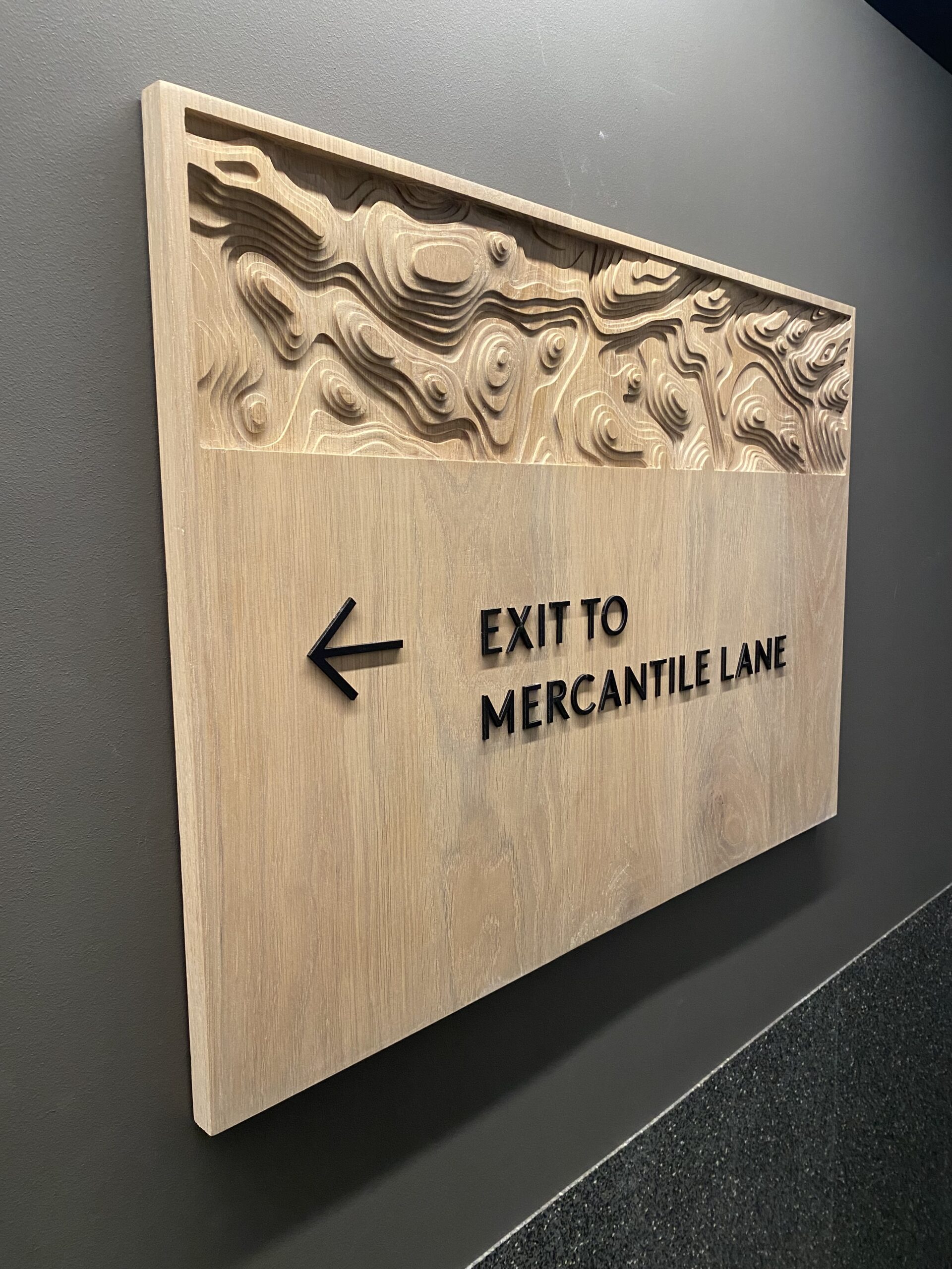 - Directional signage – on American White Oak timber panel, engraved detail into timber, black acrylic letters, fixed to wall;