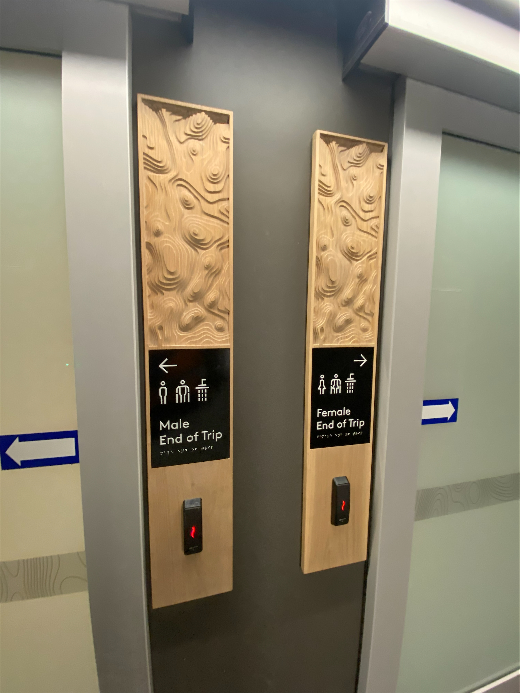- Accessible feature Wayfinding signage – located at key decision points, the wayfinding signage incorporates timber panels of American White Oak with routered detail in parametric flow patterns. Signs used to show amenities locations with braille rather than plain signage.