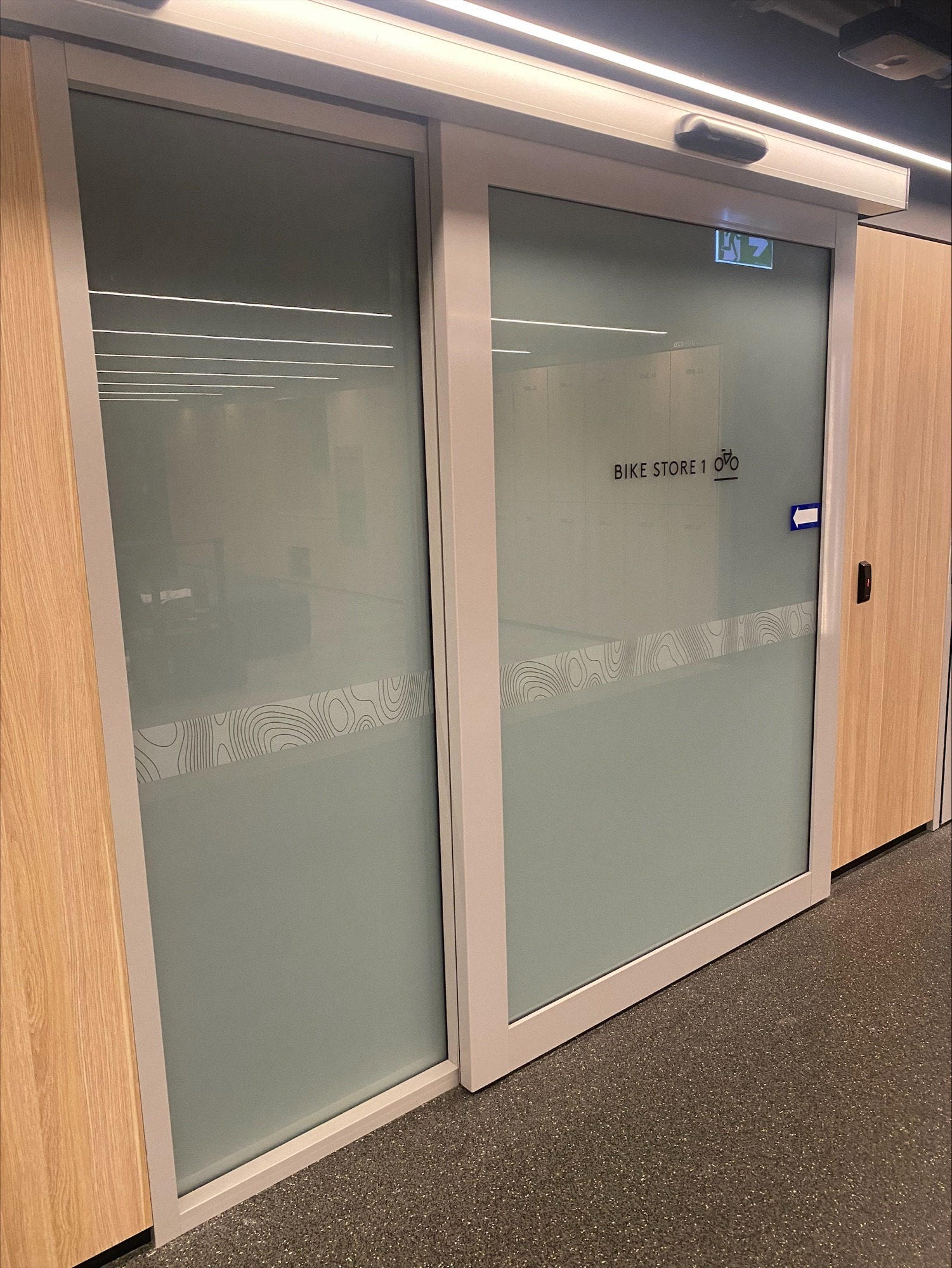 - Graphic banding – frosted vinyl banding strips installed onto glass and block out, full size, glazing panels.