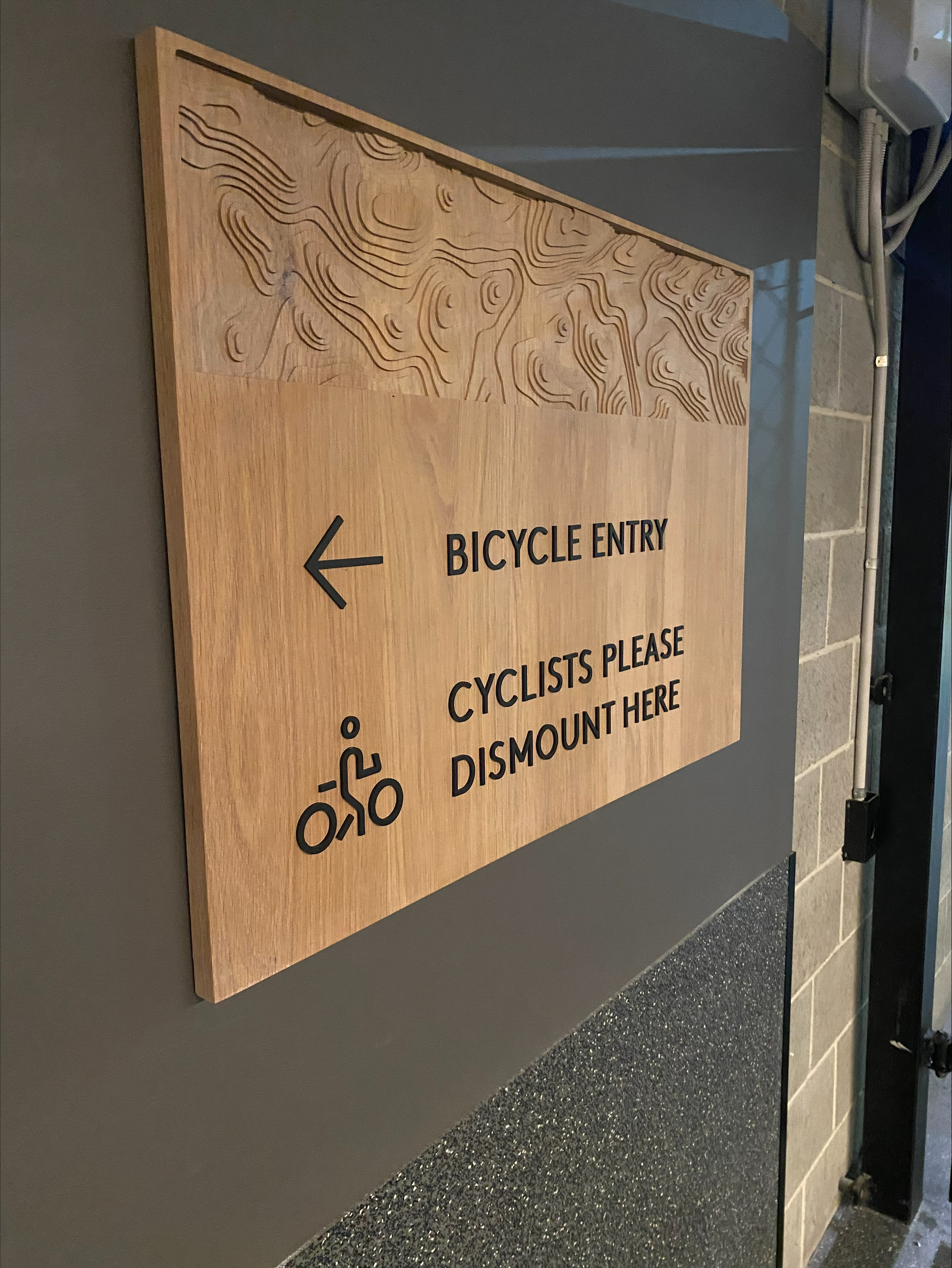 The unique features of the wayfinding signage in the project use a distinctive routered patter