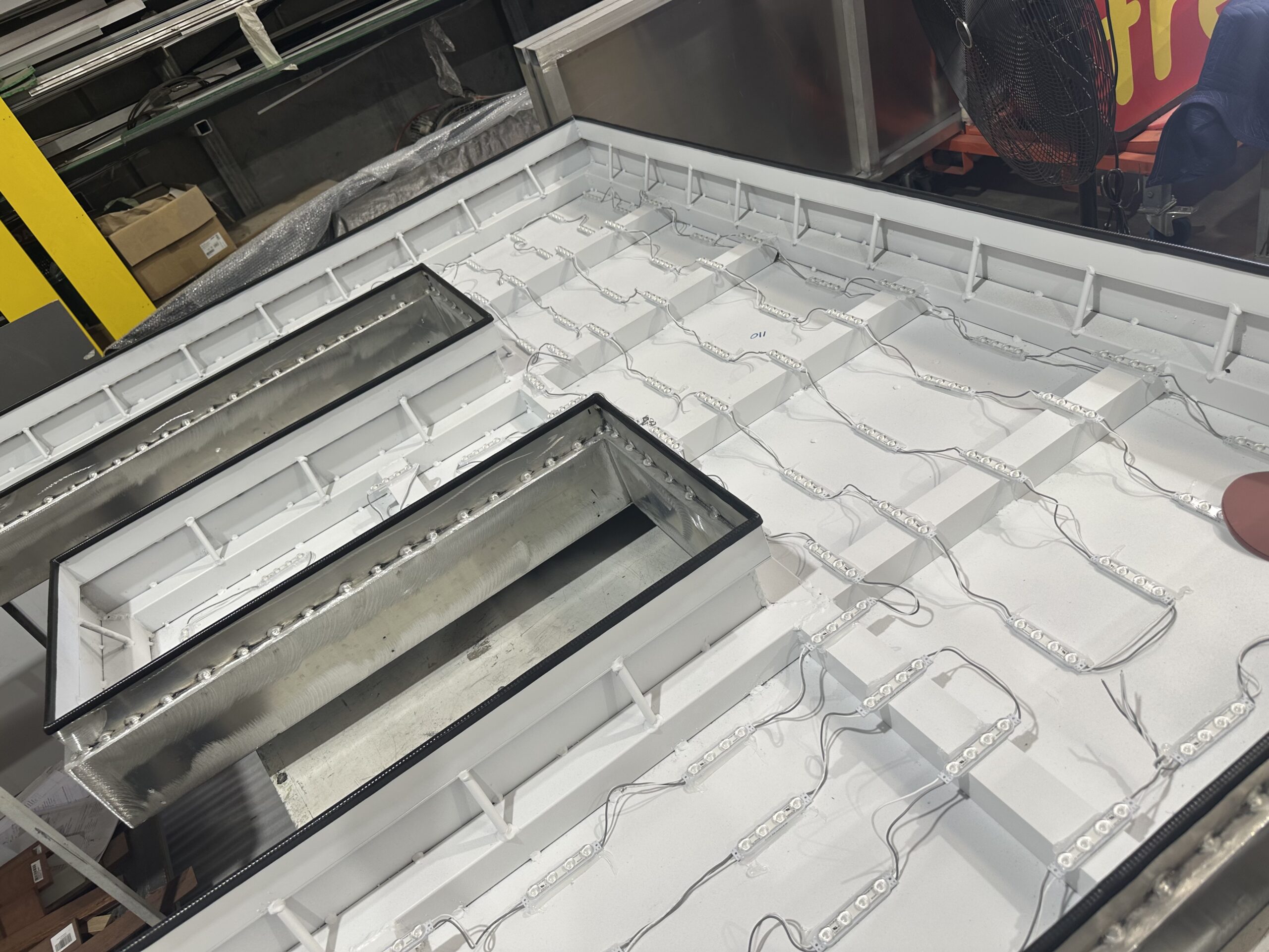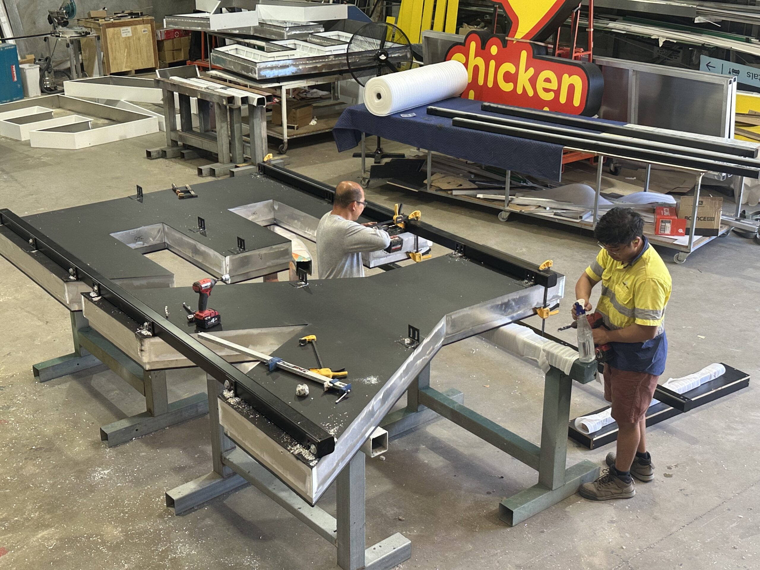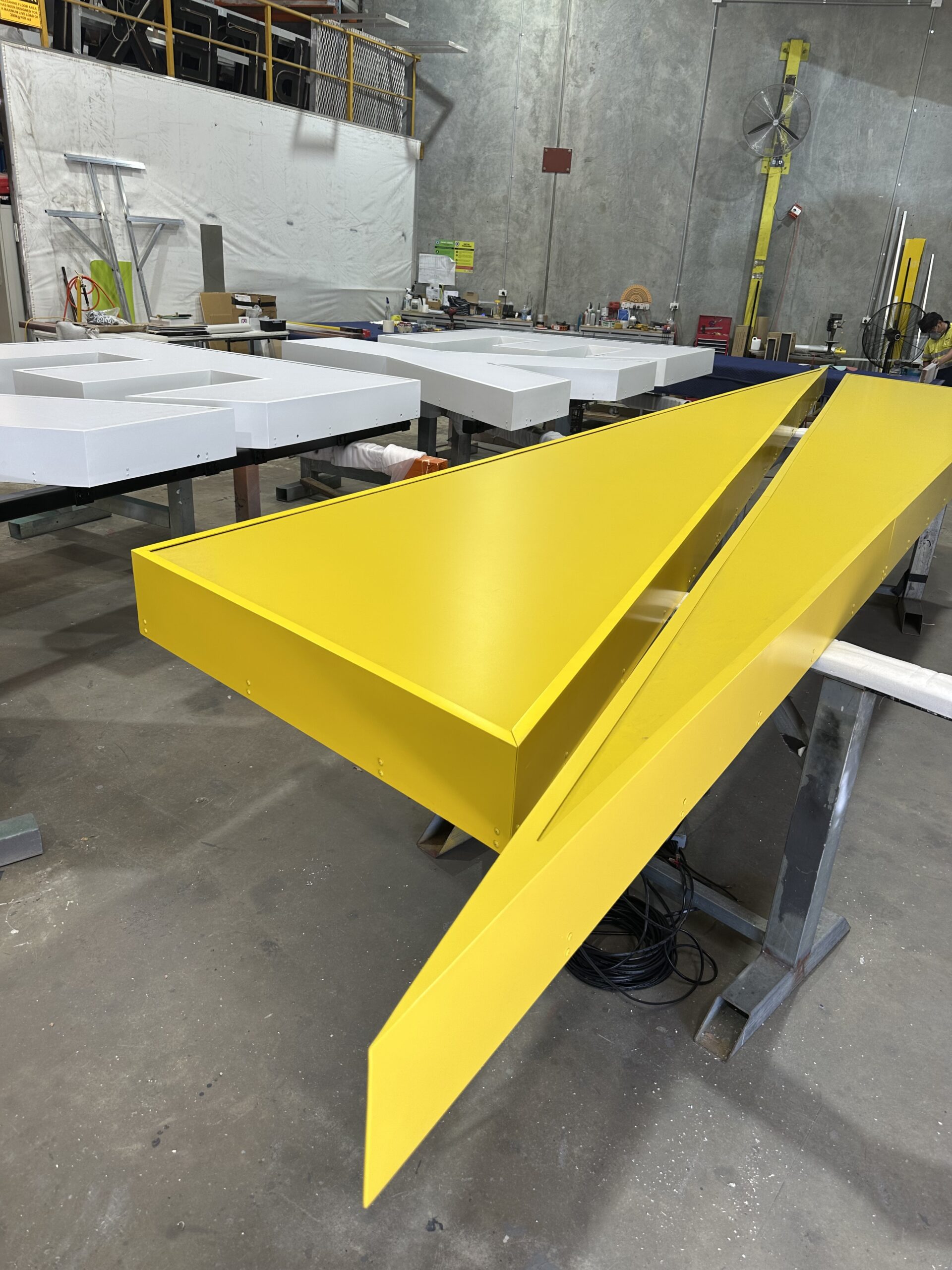 The EY 3D fabrication of the letters and beam commenced in our Midvale factory in late 2024. The project used the full talents of our design team, metal fabricators, routing area, spraypainting, LED and assembly departments. As the photos below reveal, this is a complicated process requiring skill and precision. Thankfully our team are adept in 3D letter making. Despite the scale of the works, we produced two sets of the letters and beam ready for installation in February 2025.