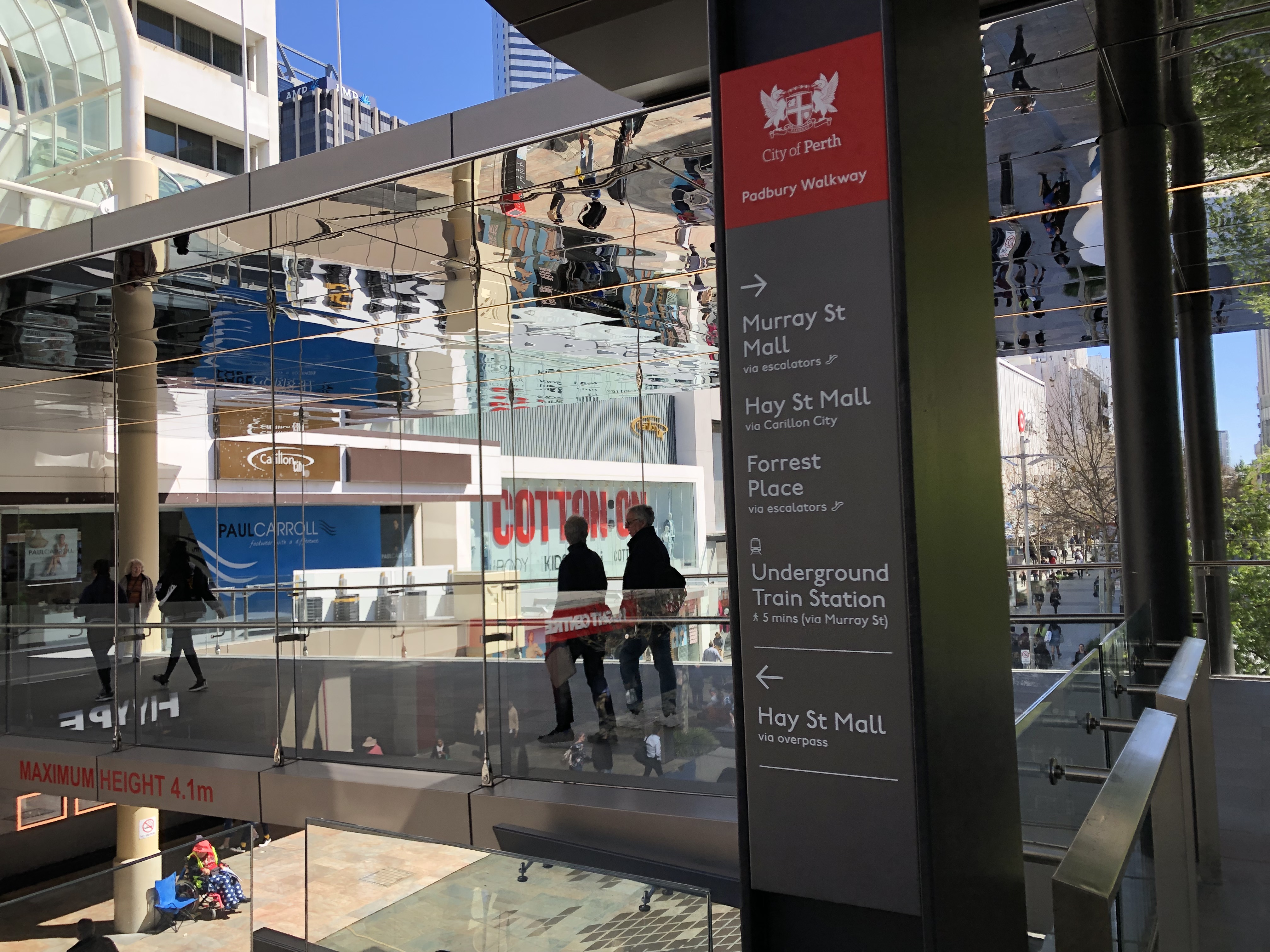 - Three 2 metre ‘City of Perth’ branded directional totems with angled tops. The signs were located at significant locations near stairways, overpasses and escalators to guide shoppers and city-goers around the space and direct them to the main and underground train Stations;