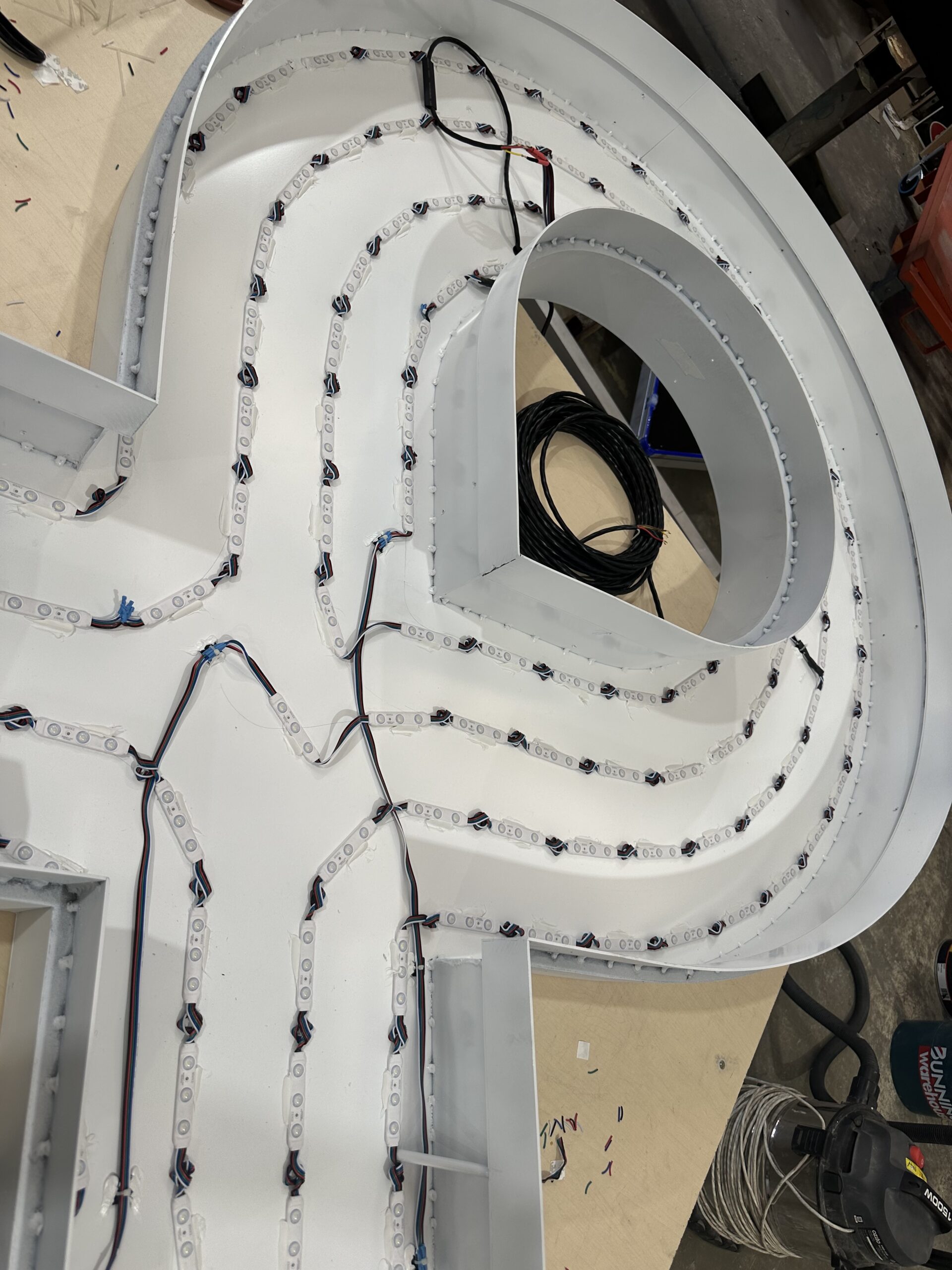 The next part of the process is the lighting. LEDs are a game-changer and provide so many fantastic colour variations. For a recent projects we used RGBW LED’s provided by Bounce LED. The LEDs are added in a carefully executed pattern to ensure optimal illumination of the signage. These colour tests were underway recently and as you can see, the letters lit to perfection!