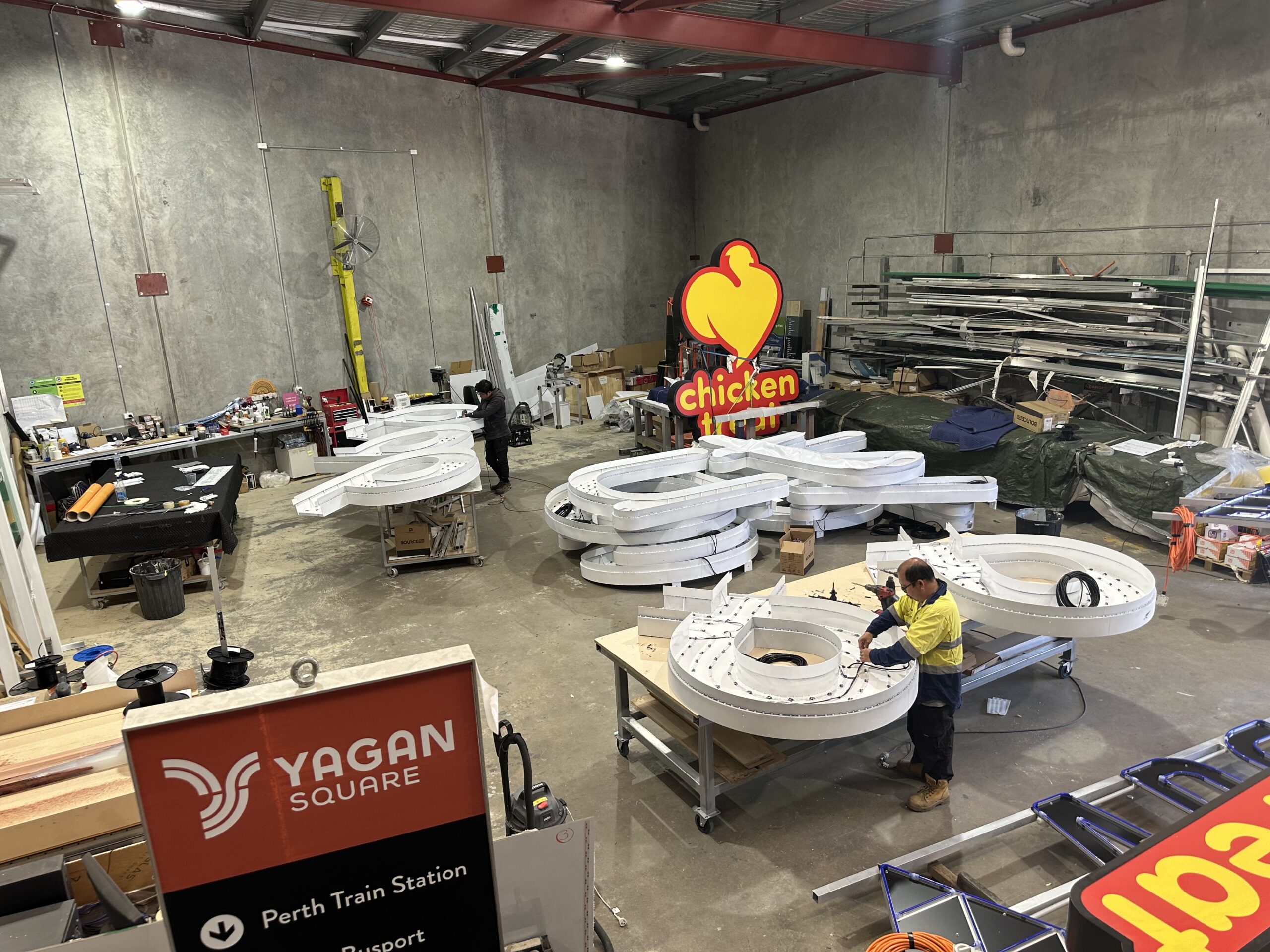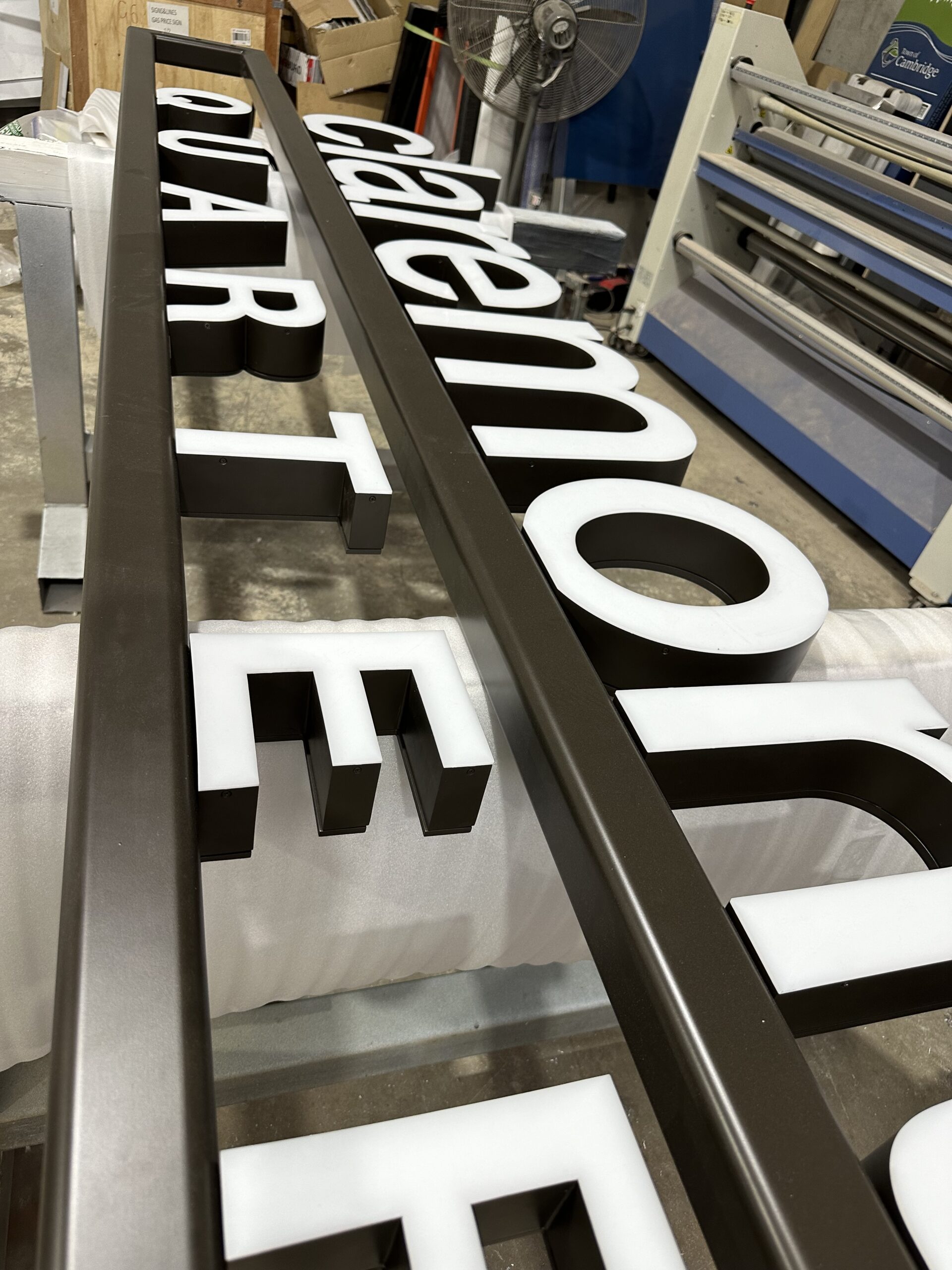 The factory images above show a wide range of signs in various stages of production during Winter 2024. The scale of some of our work is seen when you add one of our team into the photo. There is some pretty big signage underway!
