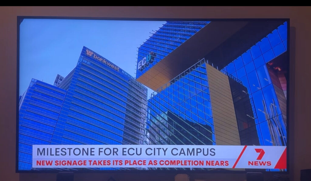 ECU City is now the proud recipient of a sky sign. The first of the large sky signs has been installed, giving this landmark project an identity. With more sky signs scheduled over the next few weeks milestone for ECU City signals that the building nears completion. Significantly, ECU City needs to be finished by mid December 2025 in time for students in early 2026. It is all systems go at Signs & Lines. We have five more sky signs to install in November. Plus a range of external totems and literally thousands of internal signs still to install across the North and South buildings. We are busy, busy bees!