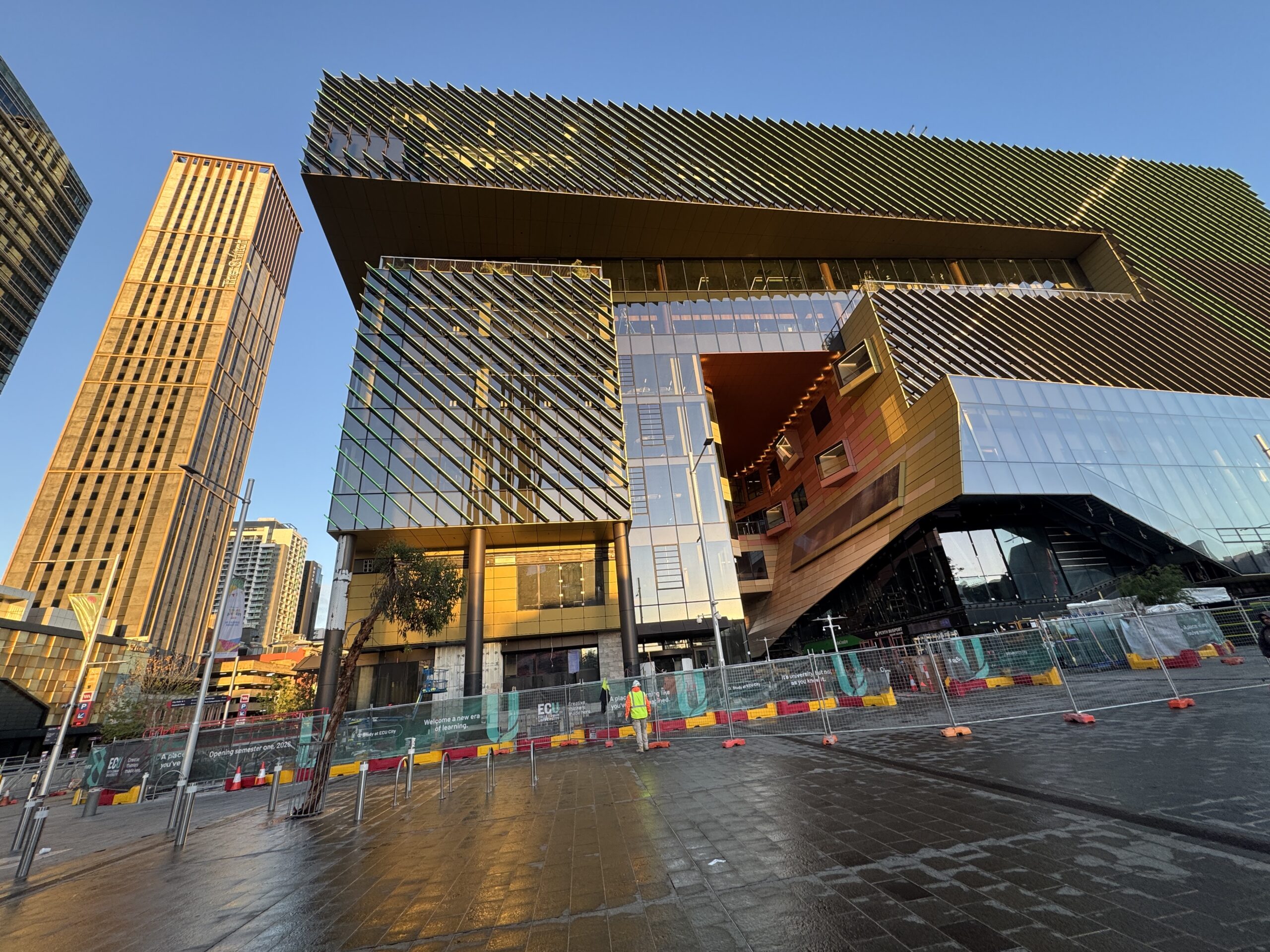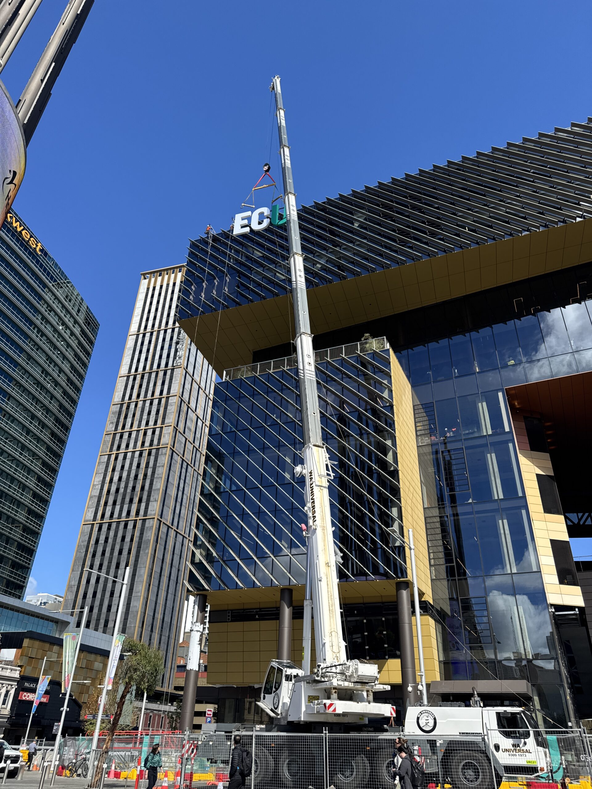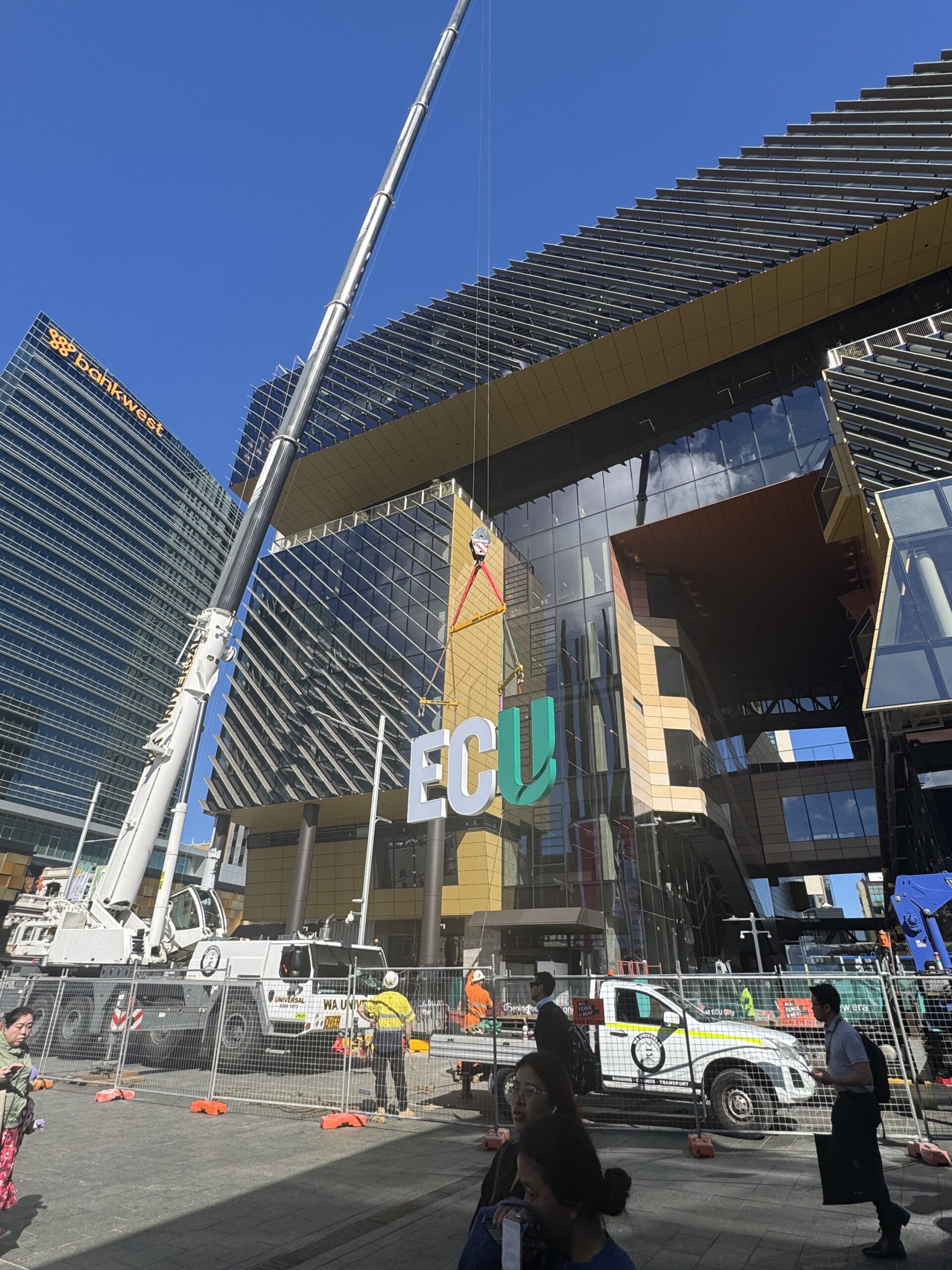 ECU City is now the proud recipient of a sky sign. The first of the large sky signs has been installed, giving this landmark project an identity. With more sky signs scheduled over the next few weeks milestone for ECU City signals that the building nears completion. Significantly, ECU City needs to be finished by mid December 2025 in time for students in early 2026. It is all systems go at Signs & Lines. We have five more sky signs to install in November. Plus a range of external totems and literally thousands of internal signs still to install across the North and South buildings. We are busy, busy bees!