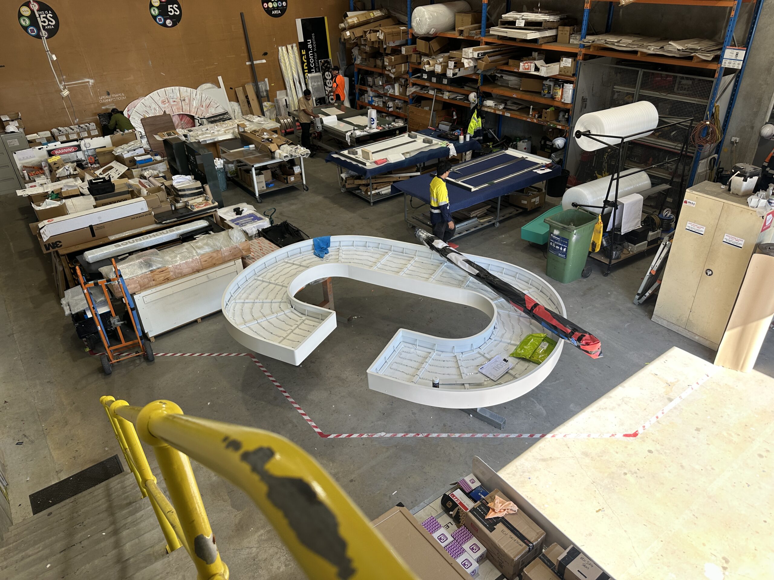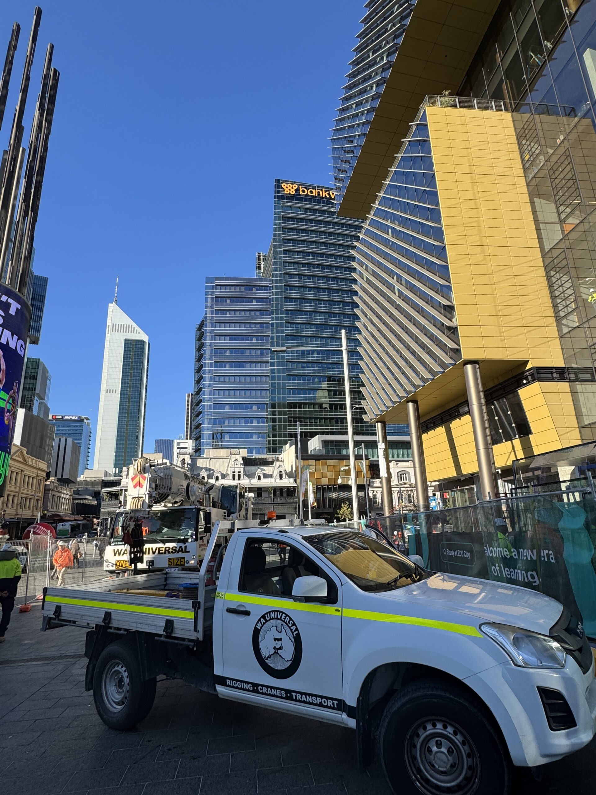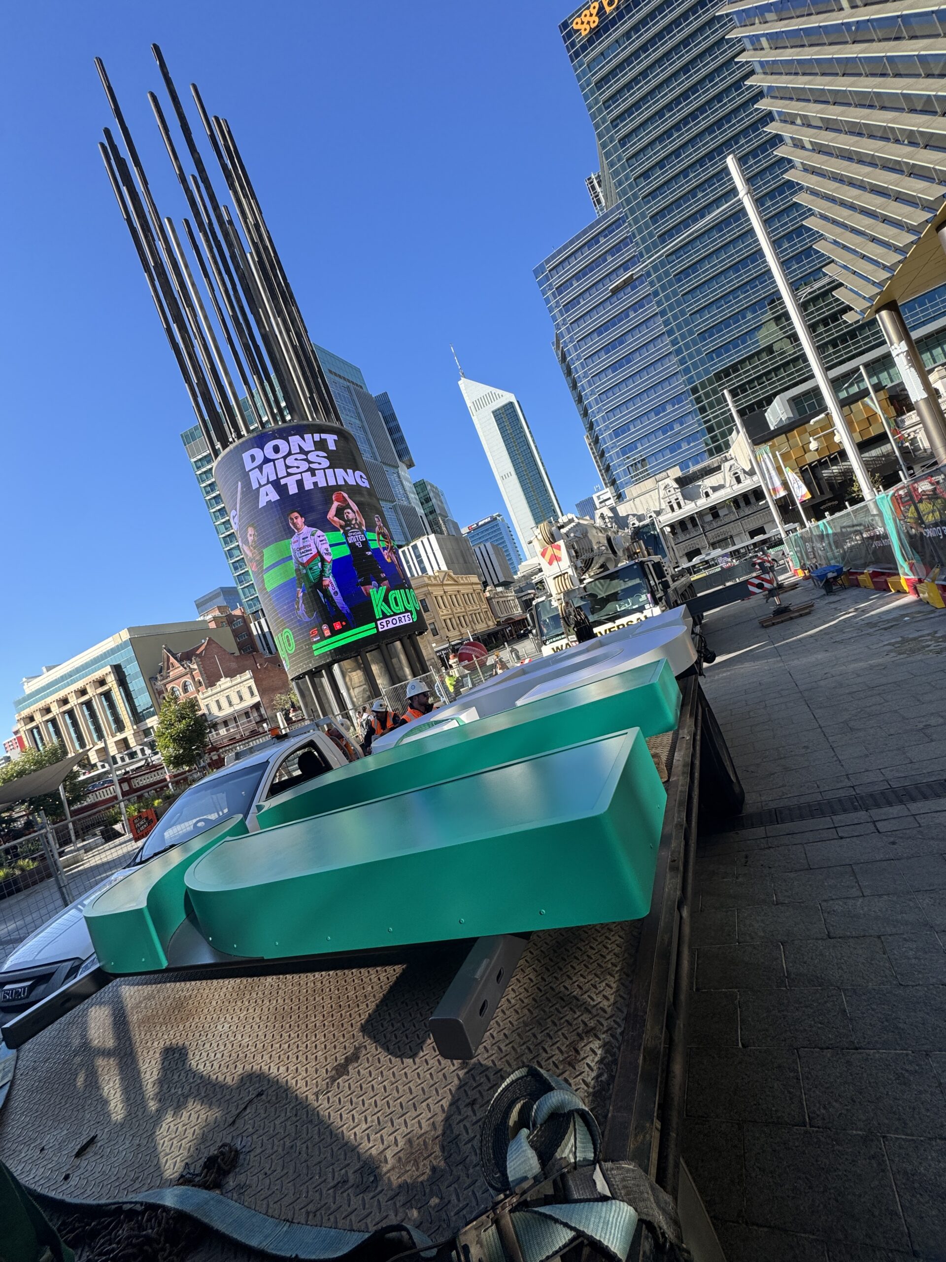 The photos below show production phases in our factory, scale of signage and the site on D-day. It was a glorious Perth blue-sky day. Site works, pedestrian and site safety management in place. And then it was up, up and into the sky…