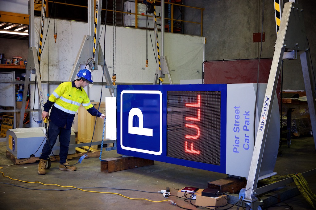 Assembly of all the components occurs in our two general workshops. These are large open spaces equipped to cater for all types of signage. It maybe a huge digital pylon, fabricated letters with LEDs going onto a crane, it maybe a massive bus that is having new graphics applied, or it maybe 40 odd wayfinding totems. Therefore, when the signage comes together, and final QA checks have been made, our installation teams can go to work.