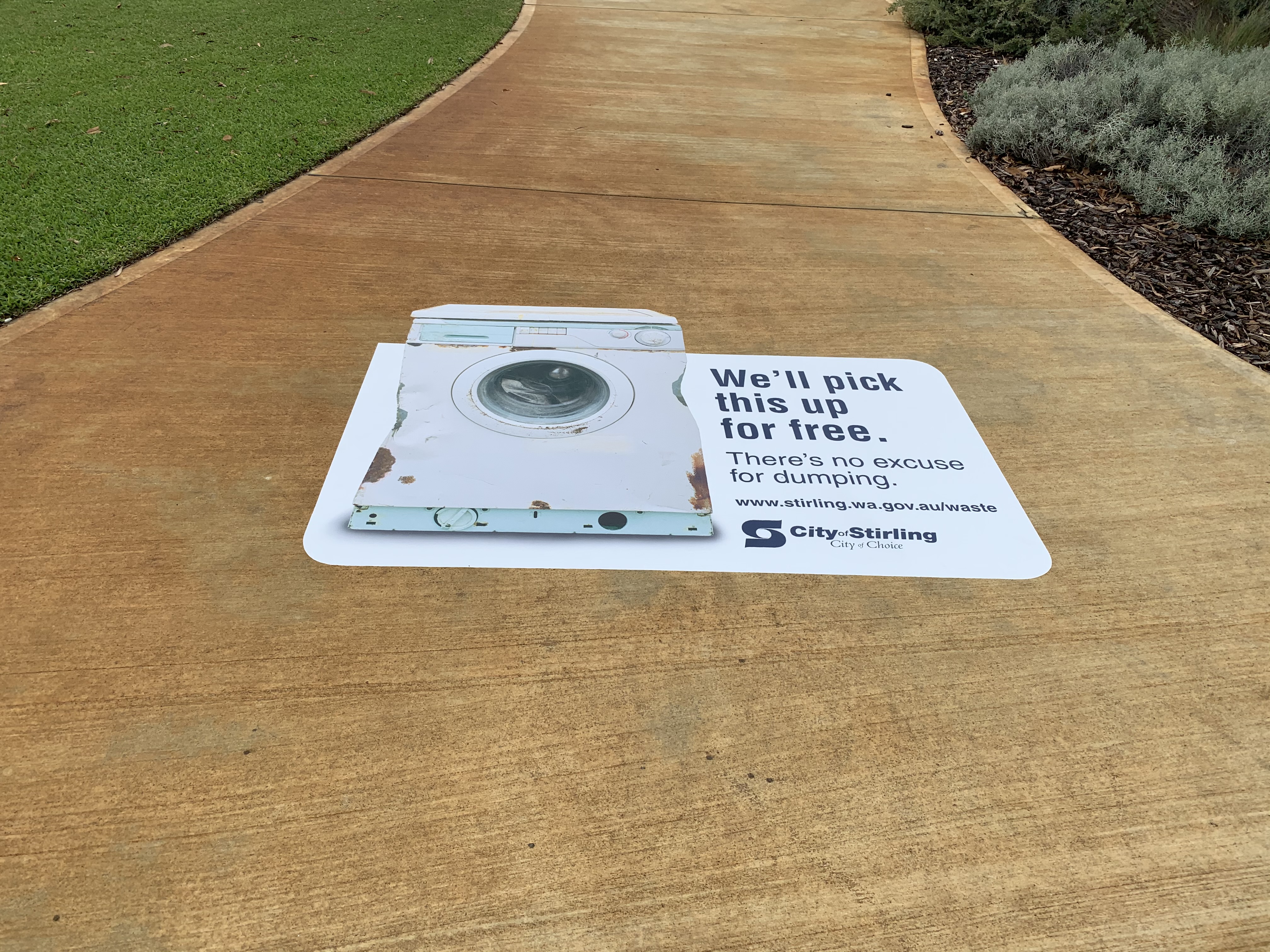 In 2019 we completed a series of anamorphic graphics for City of Stirling’s ‘illegal dumping’ campaign. Illegal dumping costs the City of Stirling more than $500,000 every financial year so the campaign was designed to focus residents on better waste management options.