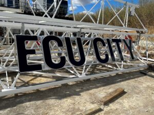 Lighting takes this even further. Integrated LED systems keep signage bright during both day and night, maximising exposure around the clock. Our ECU City Campus sign, for example, uses a white neon rope with 200+ LED lights to create a strong halo effect that stands out sharply against the night sky.