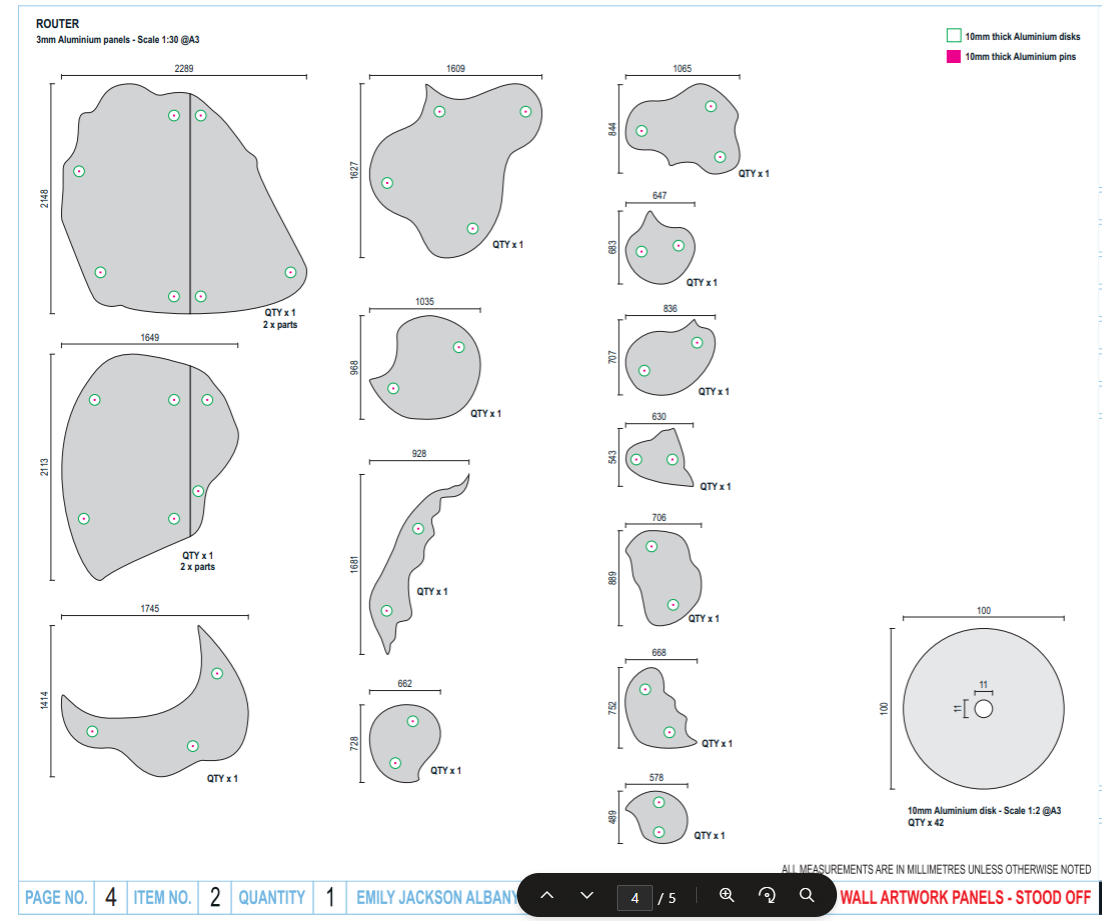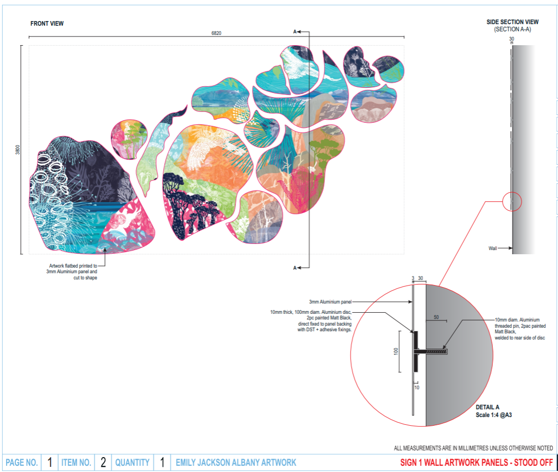 In this blog we explore the behind the scenes work behind these wall displays in South West WA. As they say, the devil’s in the detail. The designs below show the complexity involved in creating a wall display. Aluminium plate was use for durability. Each wall section was designed with fixing holes pre-cut. The assembly team applied the graphics to the aluminium ready for the jigsaw puzzle installation on site.