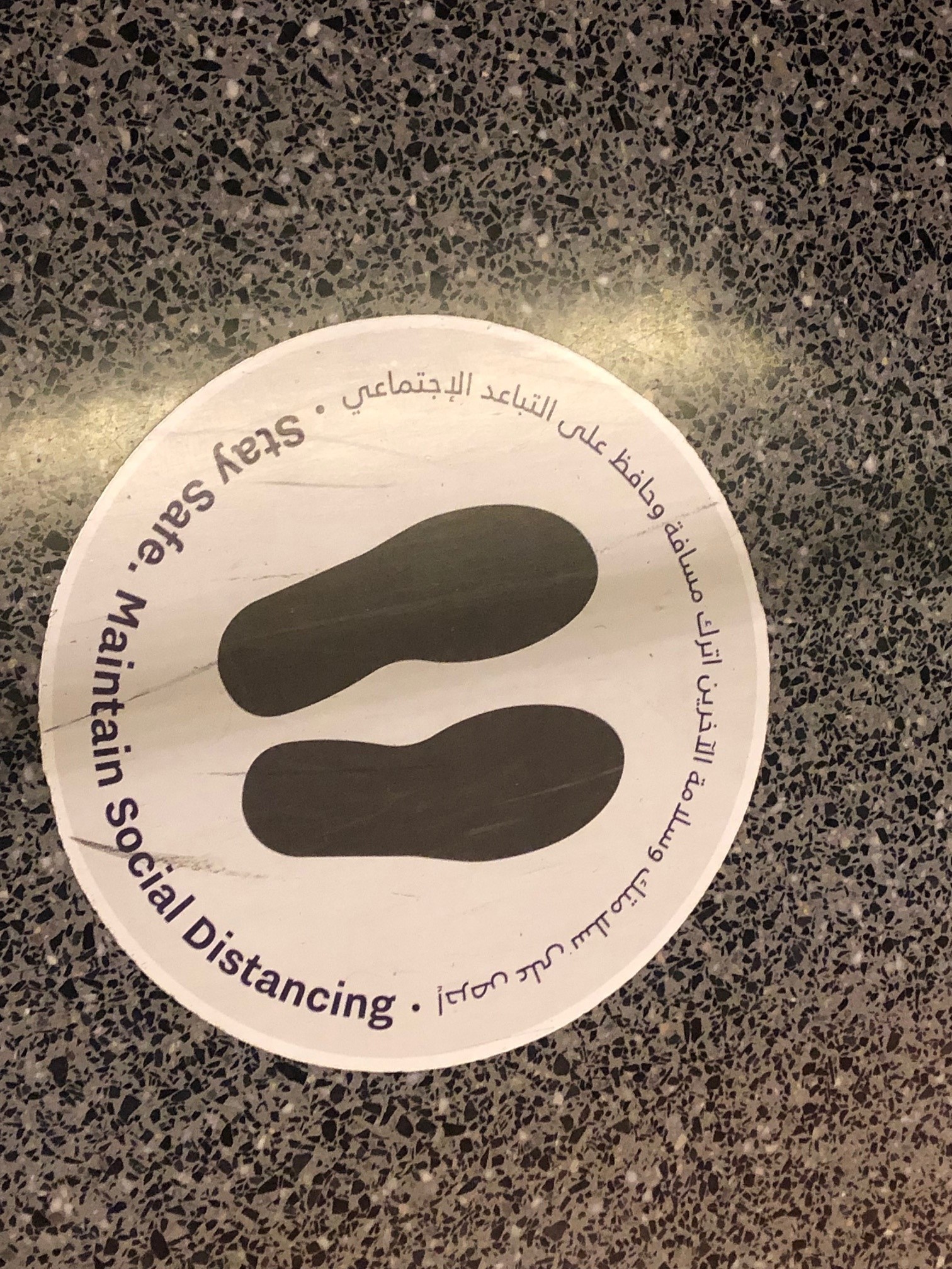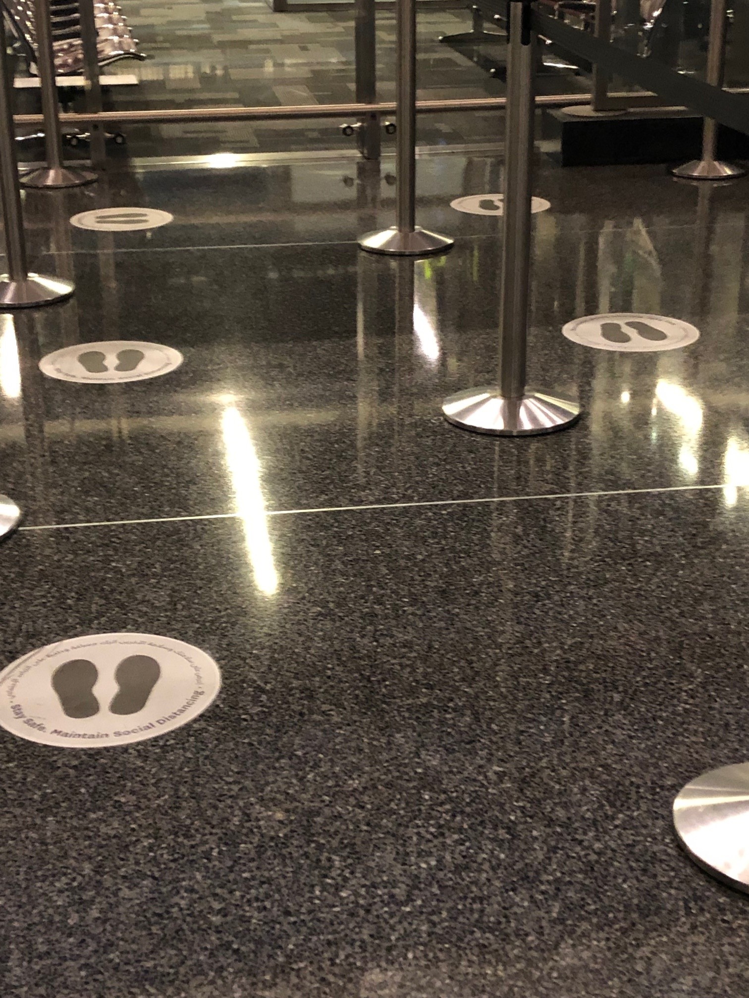 Firstly, floor signage is being used in places where travellers queue. This helps people observe correct social distancing (when they are possibly distracted by other things!)